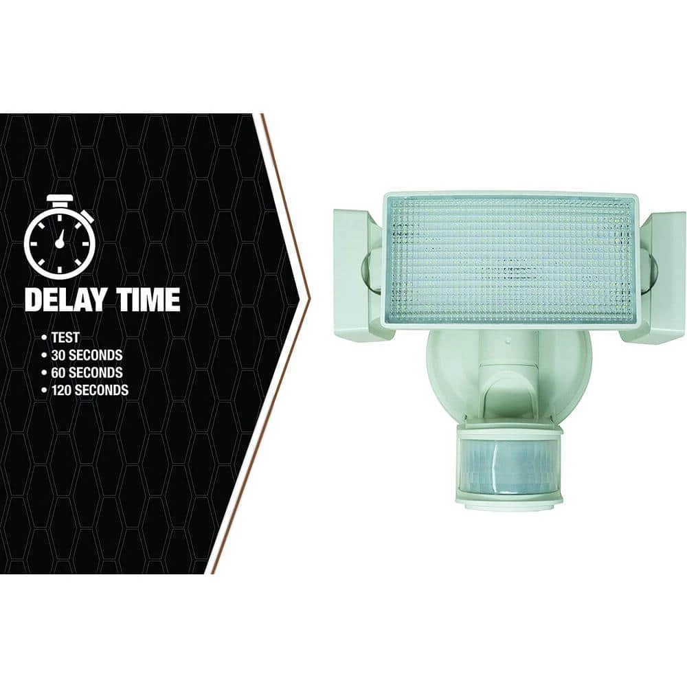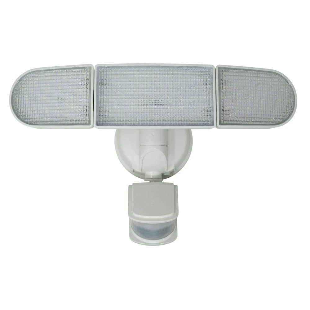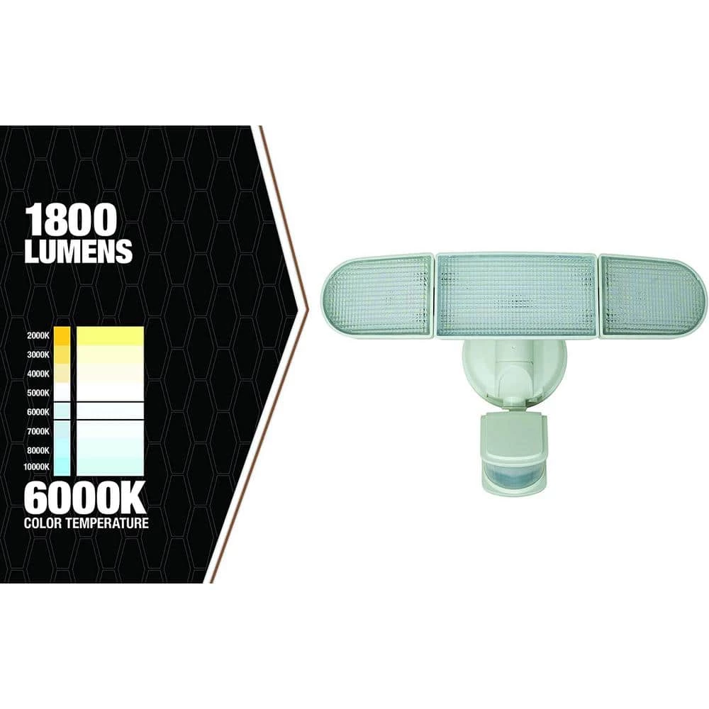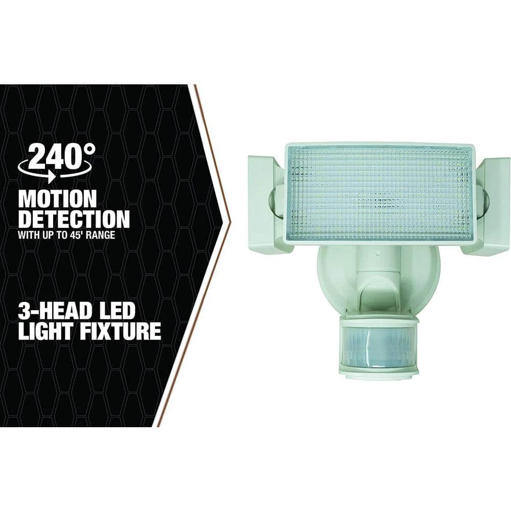 Enjoy the safety of the 240-Degree Solar Motion Activated White LED Security Light featuring a 3-head light with a 240-degree motion detector and a range that reaches up to 45 feet. This security light is quickly triggered by humans, animals, cars, or other moving objects and works efficiently in a variety of locations such as garages, backyards, porches, and driveways. The timer can be set to keep the light on up to 30, 60, or 120 seconds after the last trace of movement has been detected. Provides 1,800 lumens of light at a 6,000k color temperature for ideal lighting.
