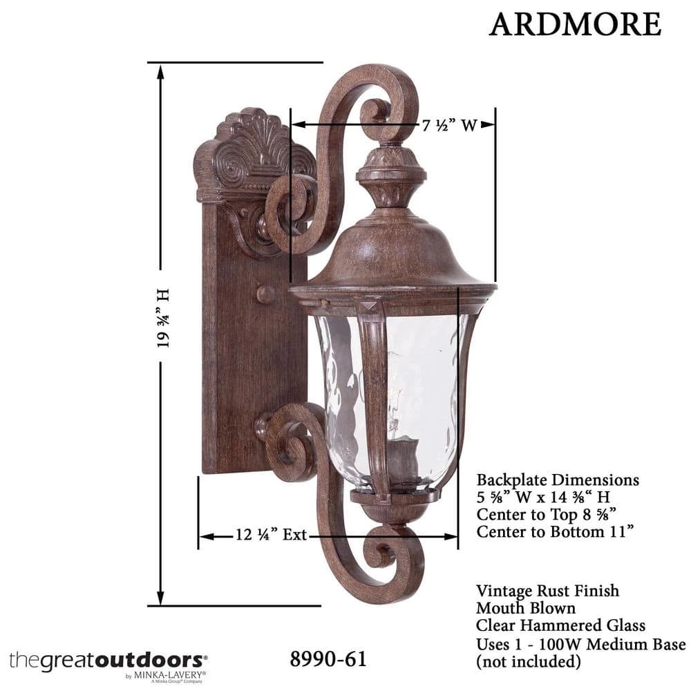 The great outdoors by Minka Lavery Wall-Mount 1-Light Outdoor Lantern reflects classic sculpted lines. Finished in vintage rust, the mouth blown clear hammered glass adds an historic touch. This fixture is scaled for residential or commercial applications.