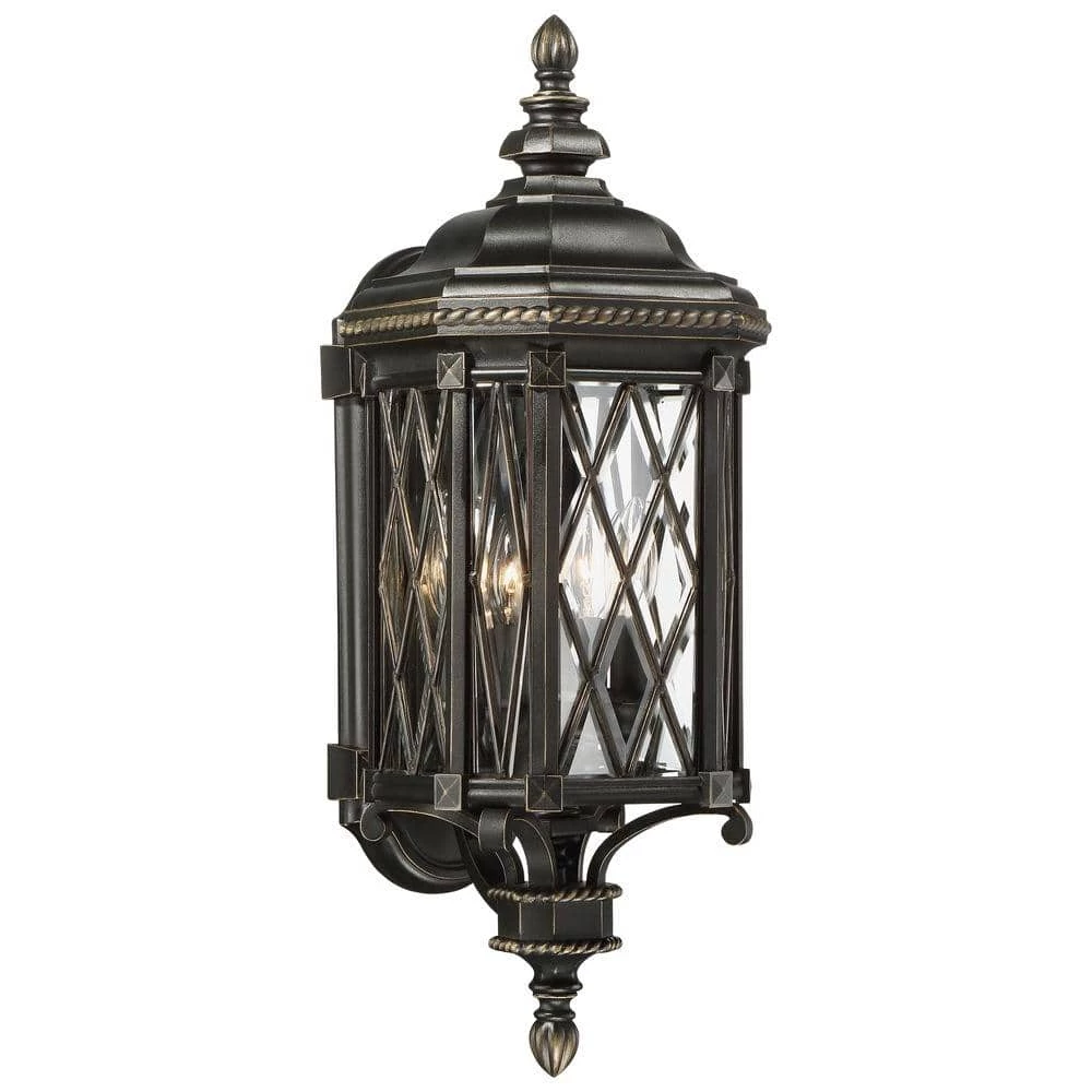 Bexley Manor by Minka Lavery’s The Great Outdoors brings class and sophistication to any outdoor space with this antique wall sconce. Its Black finish with gold highlights gives the piece an elegant air that accents any outdoor space in a lovely way. The elegant work of the sand-cast aluminum continuous cage contrasts with the clear beveled glass inside. Its large size and lovely details ensure that this light will be noticed as it illuminates and inspires in your outdoor space.