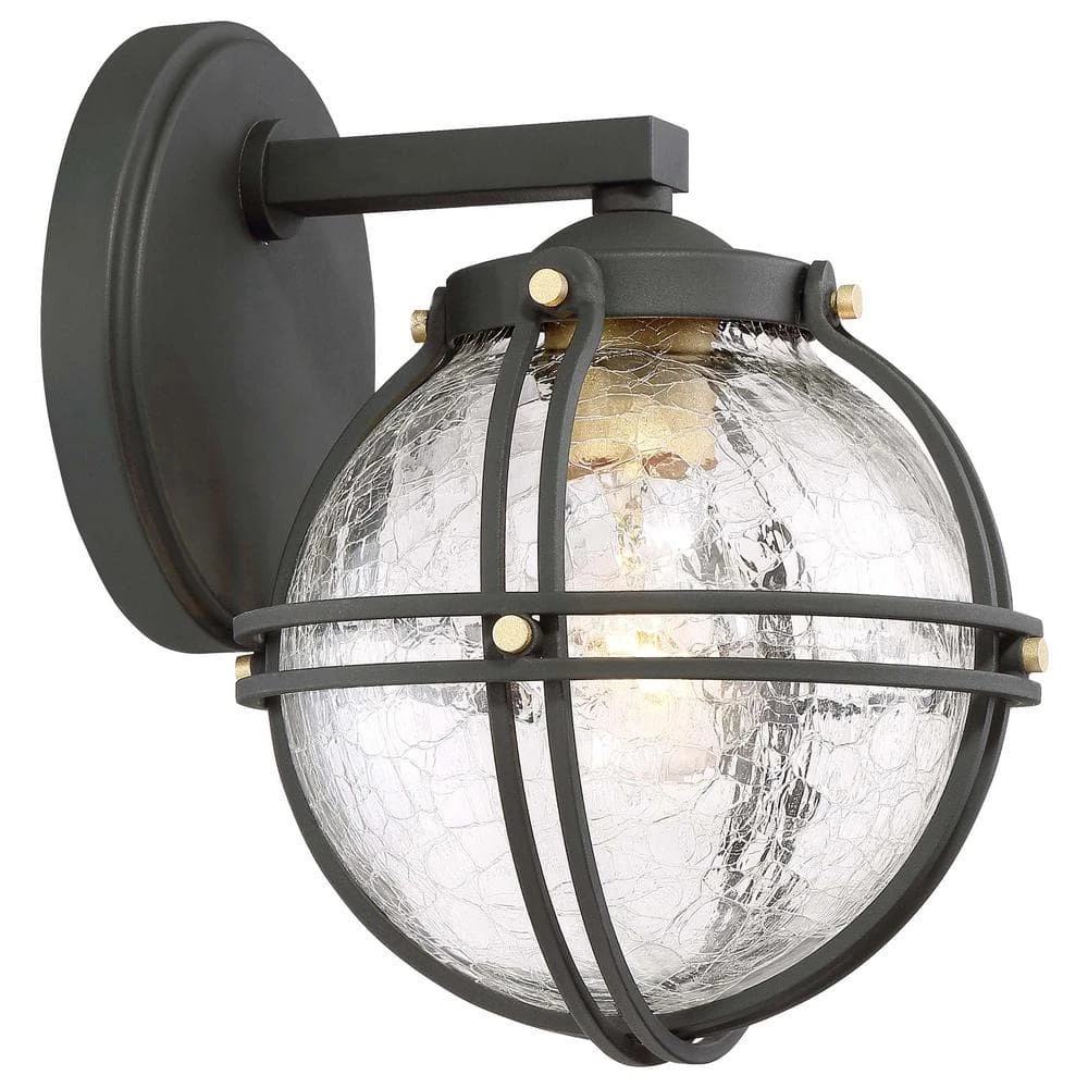 Enhance your home’s exterior with the Round Outdoor Wall Sconce by The Great Outdoors. The clear crackled glass shade is gorgeously-finished with black and gold highlights, while the aluminum wall plate and frame offer top-notch durability. Make this eye-catching wall sconce part of your backyard patio or front porch and enjoy its ambient illumination for countless years.