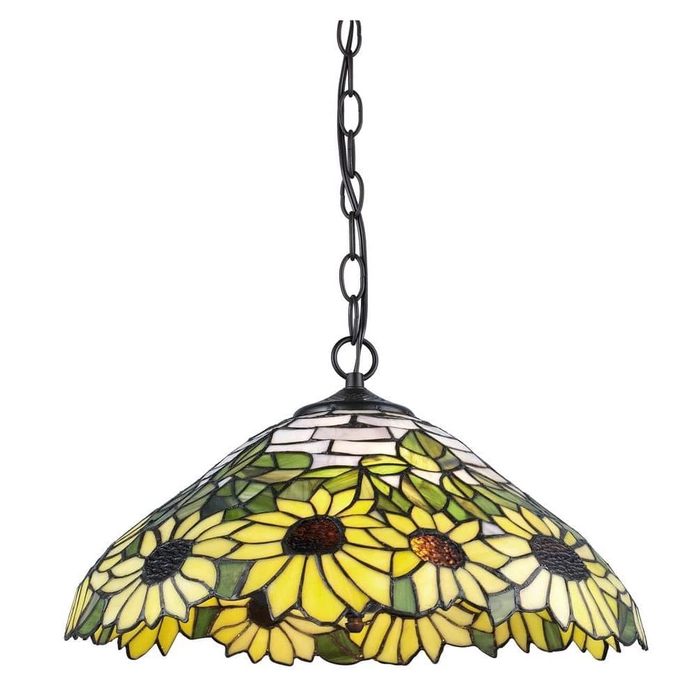 - Sunflower motif stained glass shade accentuated in rich tones of yellow, brown, and green adds elegance to any room when lit